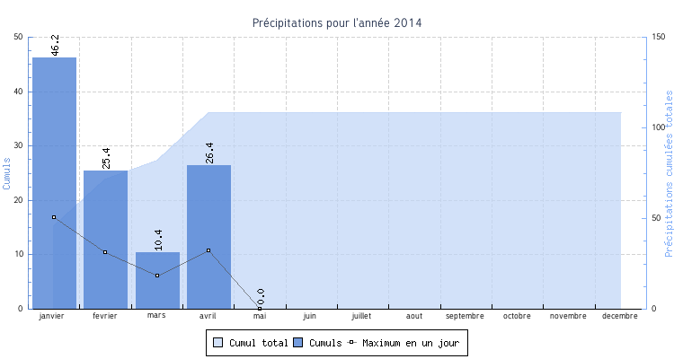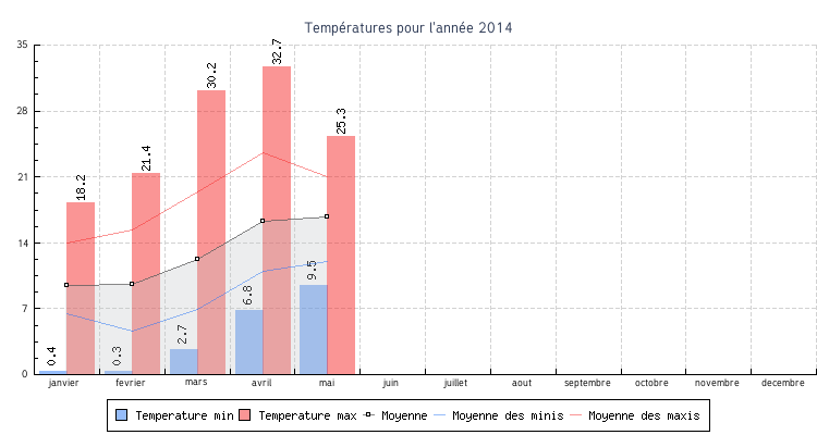| avril | 6.8 °C | 11.0 °C | 32.7 °C | 23.6 °C | 16.3 °C | 4.9 km/h | 33.5 km/h | NO |